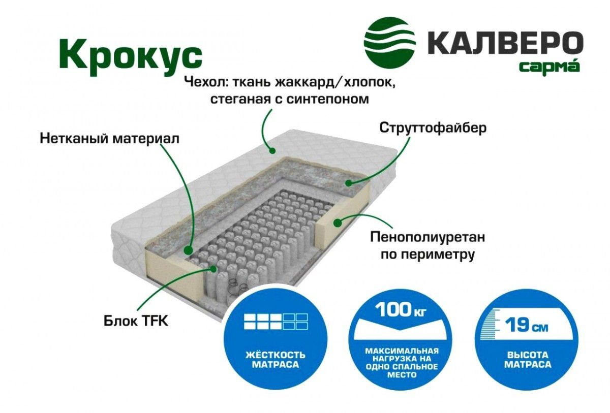 Матрас Крокус Хлопок (h190) серия Калверо вы можете купить в интернет-магазине Madimart.ru по цене 10 040 руб. Только качественная мебель от Российских брендов. Если у вас возникли вопросы или вам нужна консультация по наличию, срокам доставки, ценам, обращайтесь любым удобным способом.Вы можете оформить заказ любым удобным вам способом: